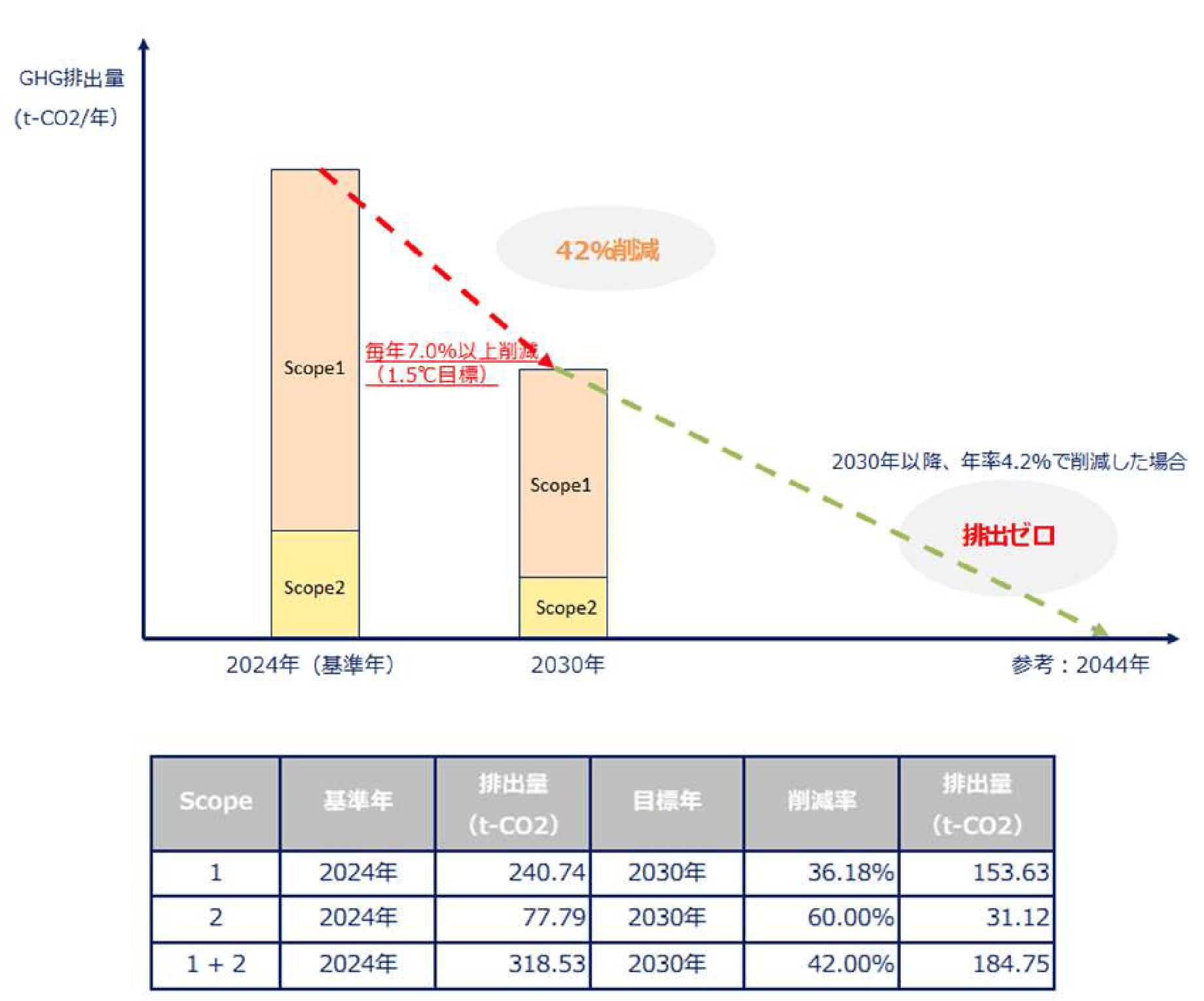 Scope1とScope2のCO2/二酸化炭素排出量を2024年の基準年から2030年までに42.0%削減し、